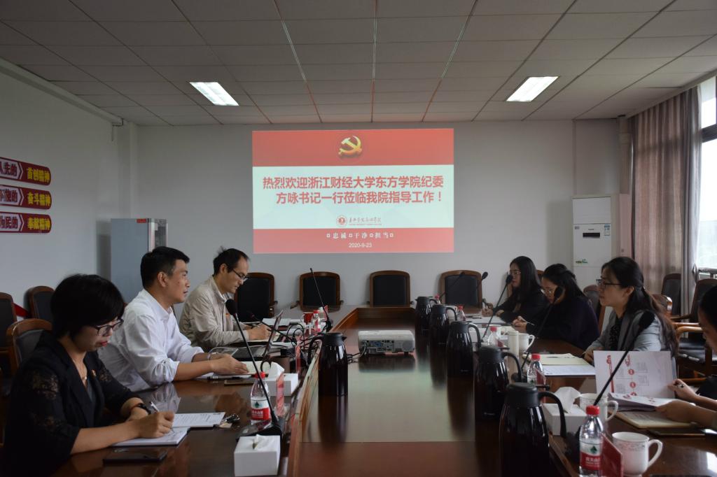 9月23日下午,浙江财经大学东方学院纪委书记方咏一行5人到访我院,与我院纪委开展工作交流。 座谈会上,杨燕群书记向方咏书记一行表示热烈欢迎,介绍了学院办学情况,并分享了学院小微权力清单梳理、风险排查和校内巡查整改等工作经验体会。双方重点围绕小微权力运行监管、内部审计、纪检监督方式创新、干部廉政档案建设和校地合作等方面的议题进行了深入的探讨交流。 我院纪委委员及行政中心相关人员参加本次调研座谈会。