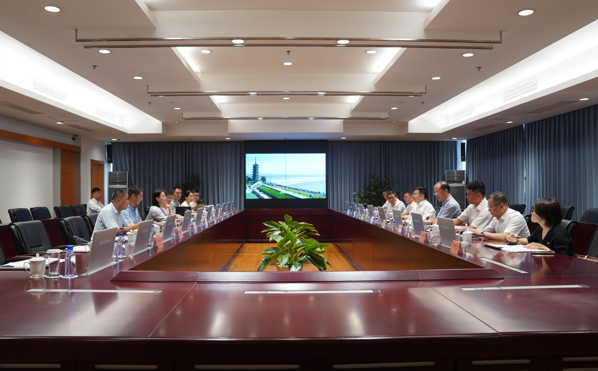 座谈会上,集体观看了海宁时尚产业宣传片,海宁市和学校有关单位就有关情况作了汇报。